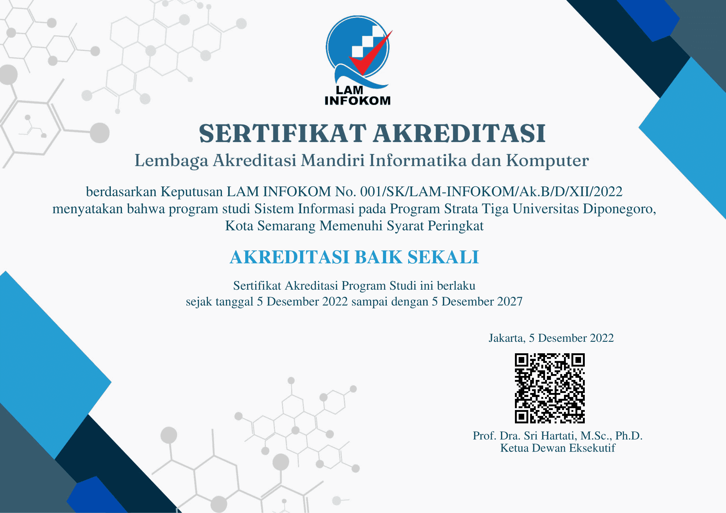 Berdasarkan Keputusan LEMBAGA AKREDITASI MANDIRI INFORMATIKA DAN KOMPUTER Nomor:001/SK/LAM-INFOKOM/Ak.B/D/XII/2022 Tanggal 5 Desember 2022 Tentang PERINGKAT AKREDITASI PROGRAM STUDI SISTEM INFORMASI PADA PROGRAM STRATA TIGA, UNIVERSITAS DIPONEGORO, KOTA SEMARANG. Menetapkan peringkat akreditasi Program Studi Doktor Sistem Informasi pada Sekolah Pascasarjana Universitas Diponegoro dengan Peringkat Akreditasi : Baik Sekali berlaku mulai tanggal 5 Desember 2022 sampai dengan tanggal 5 Desember 2027.