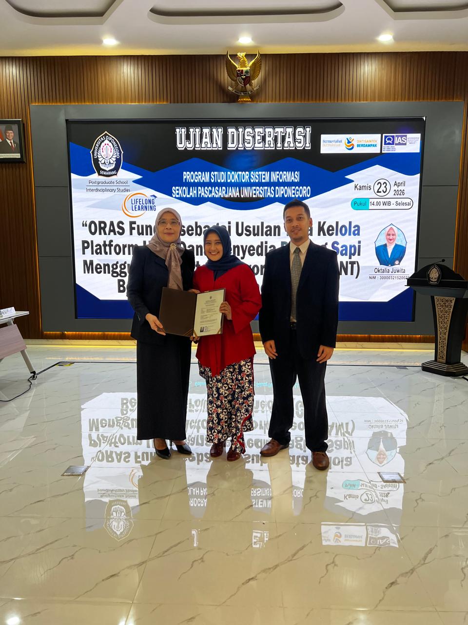 “I deeply appreciate the successful completion of this doctoral dissertation defense. Oktalia Juwita was able to complete her studies with a Very Satisfactory Grade despite having to travel from Jember to Semarang. Her research, which is about Using the PORAS Funder Model as a Proposed Governance Model for a Beef Crowdfunding Platform Using Actor-Network Theory (ANT) Based on Grounded Theory (GT),”